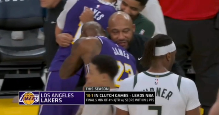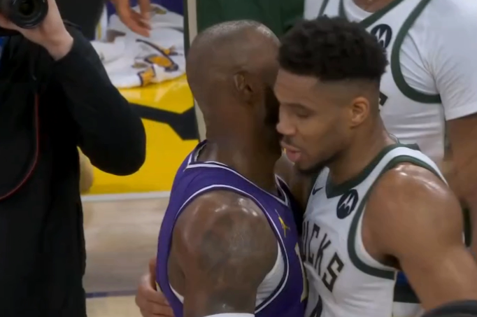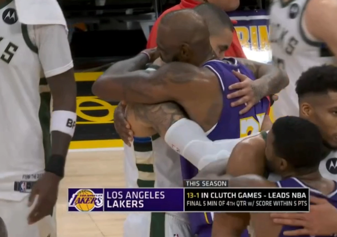 临了16秒小波特三罚两中,詹姆斯保护篮板,可湖东说念主临了一攻,雷迪克不喊暂停,浮现不息打,最终詹姆斯运球被字母哥抢断,范德比尔特只可秉承犯规战略,波特两罚全中透澈杀死比赛,临了0.6秒喊暂停如故太晚,最终湖东说念主4分惜败。赛后,詹姆斯与字母哥拥抱疏浚很久,之后与特纳、库兹马以及雄鹿助教哈姆(前湖东说念主主帅)拥抱问候。