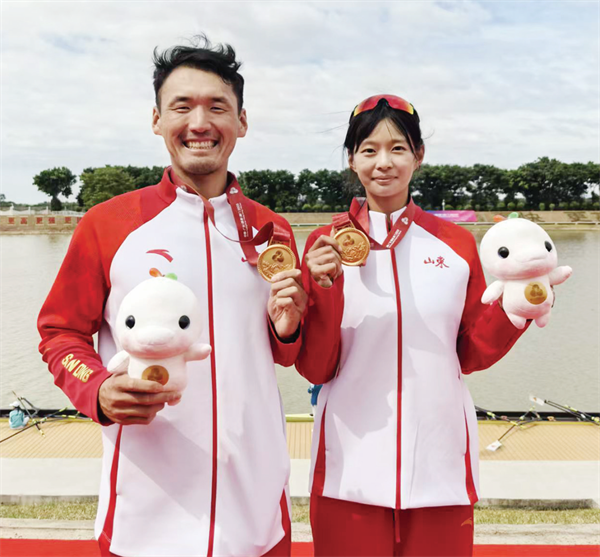 张松虎(左)和王婷婷(右)与队友分获男女八东说念主单桨有舵手名堂金牌。
