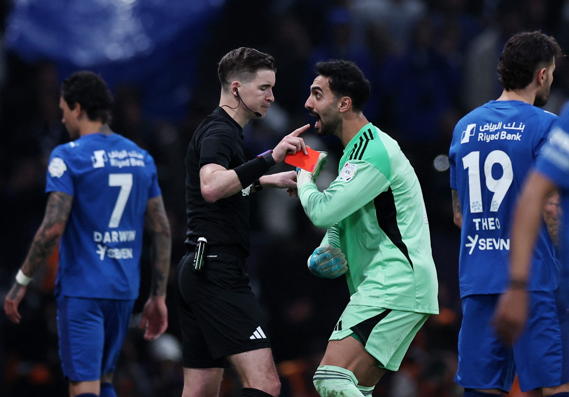 肘击内维斯染红!官方:告捷门将阿奇迪停赛2场,罚金2万里亚尔