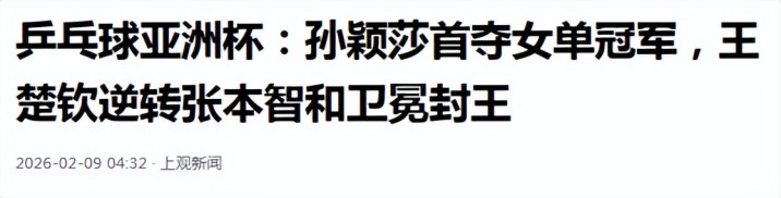 上不雅新闻《乒乓球亚洲杯:孙颖莎首夺女单冠军,王楚钦逆转张本智和卫冕封王》发布时辰:2026.2.9
