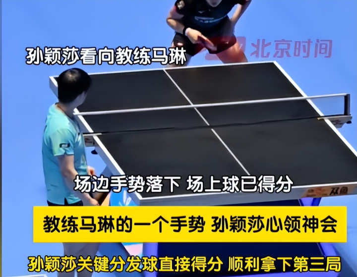 比如对金娜英那场,第三局关键球时,孙颖莎回头看了马琳一眼,马琳一个手势,她坐窝心领意会,按请示推论,立时就发球得分并拿下那一局。